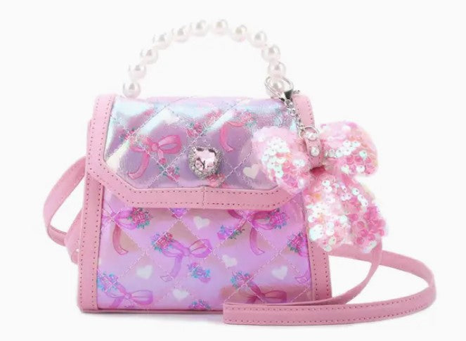 A girly girl's dream! This multicolored floral and bow printed quilted mini crossbody is a metallic must-have! With a faux pearl top handle, adjustable crossbody strap, and rhinestone embellishment, it's perfect for the mini who loves to add a touch of whimsy to her 'fits! It even comes with a sequin bow bag charm for an extra embellishment!