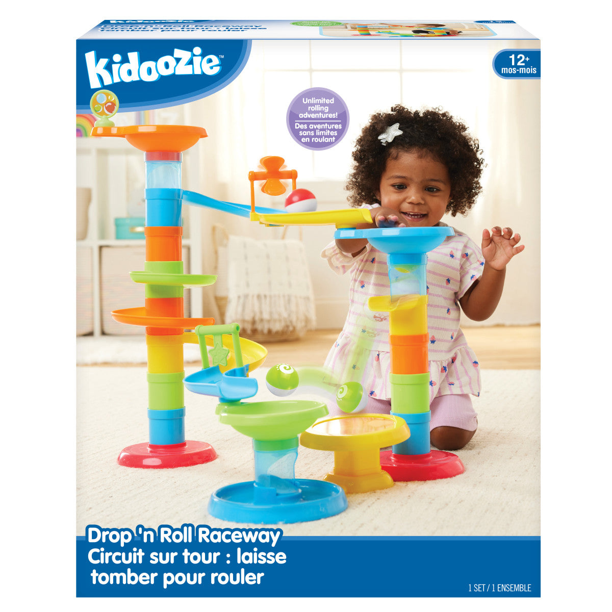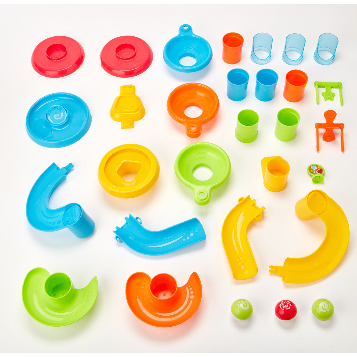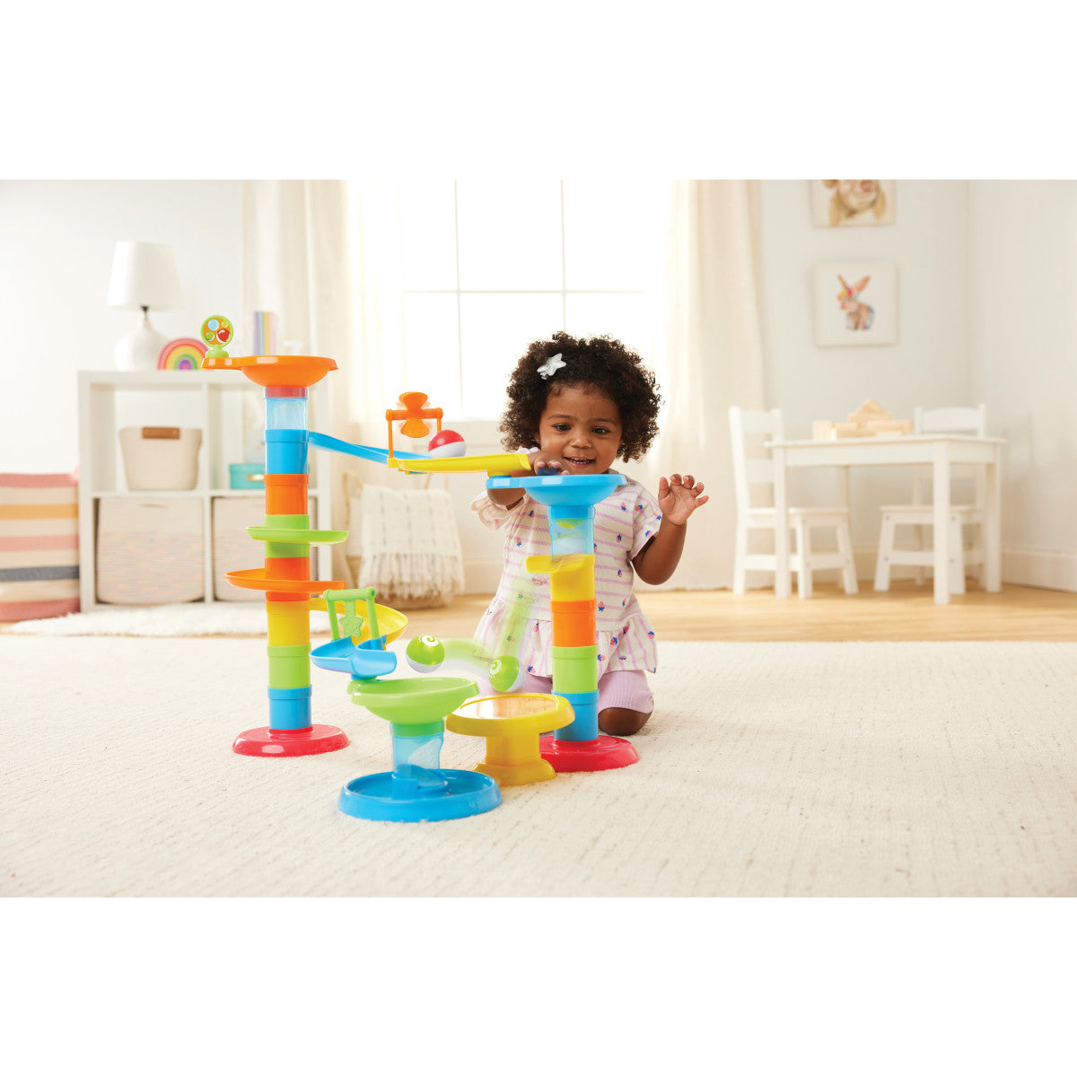 This ball tower is 21" tall and provides hours of developmental fun. 3 colorful balls to cascade down the different levels. Twisting ramps, swinging gates and a ball trampoline provide engaging fun!