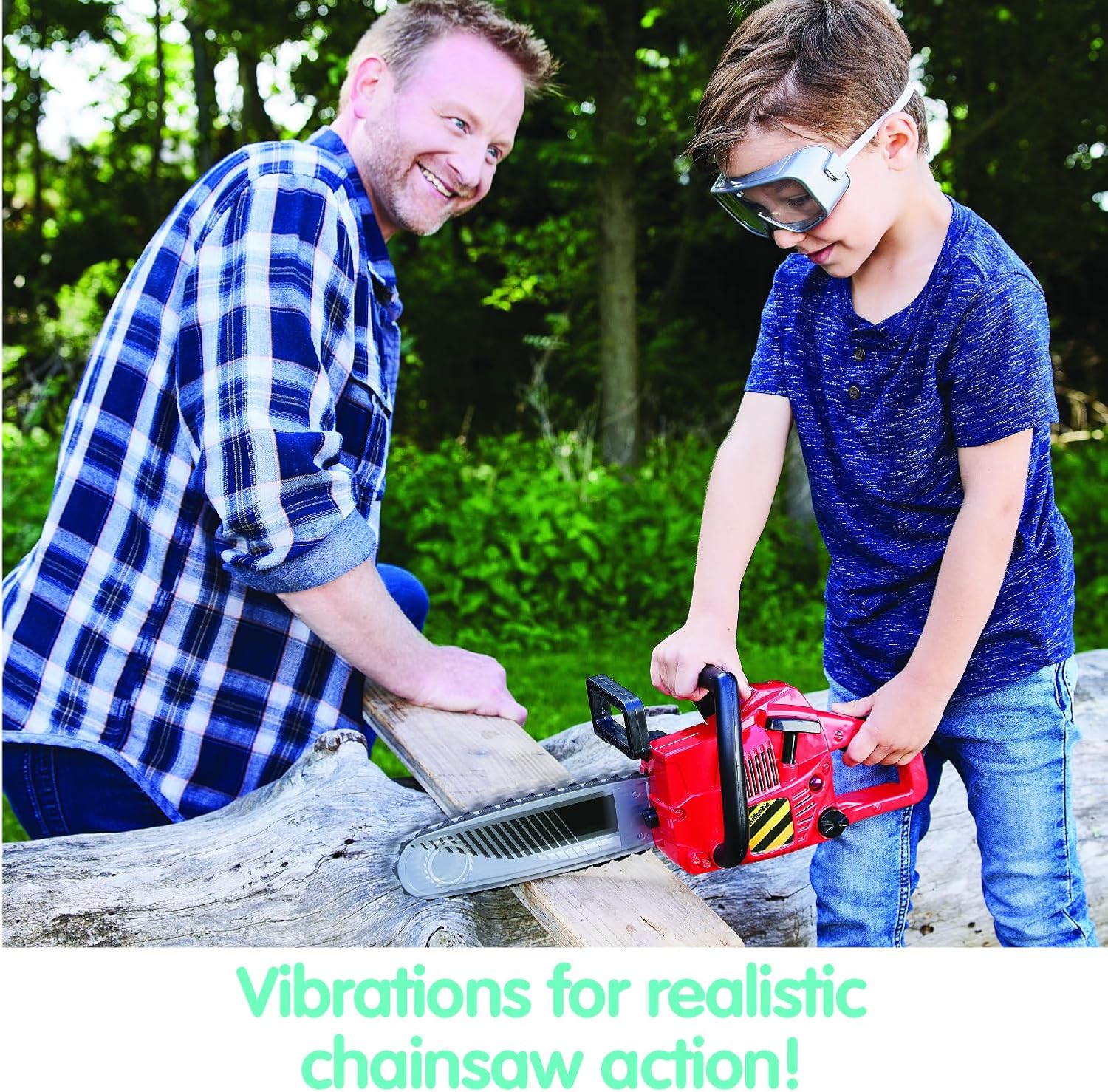 The Kidoozie Just Imagine Power Chainsaw provides hours of pretend play for your child. It lets kids pretend to work in the backyard just like dad. Simply pull the starter handle then squeeze the trigger. It features realistic sound effects and lights.